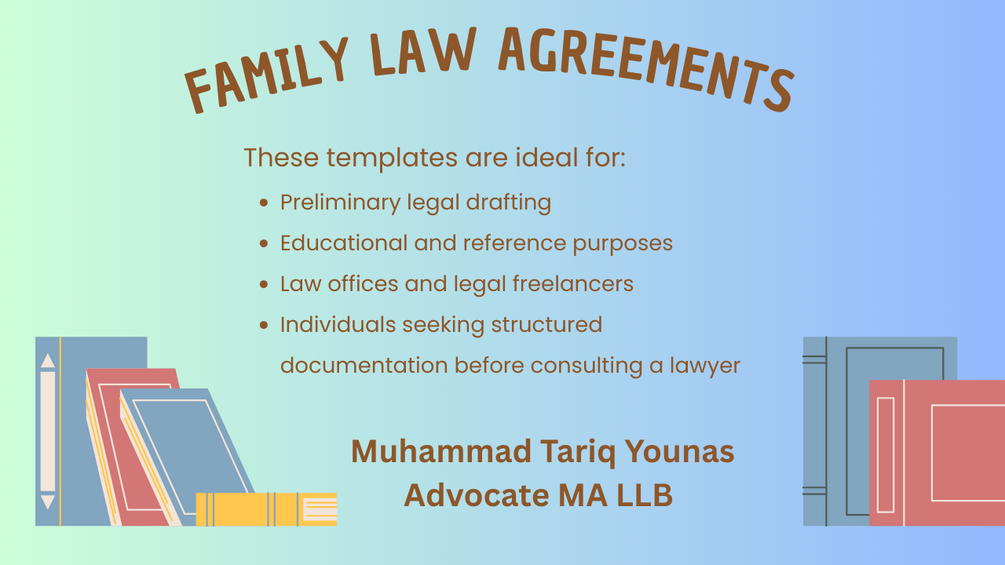 This product includes a set of carefully structured Family Law Agreement templates prepared by an experienced legal practitioner. These templates are intended to assist individuals, lawyers, consultants, and legal researchers in drafting clear and organized family law documents without starting from scratch.